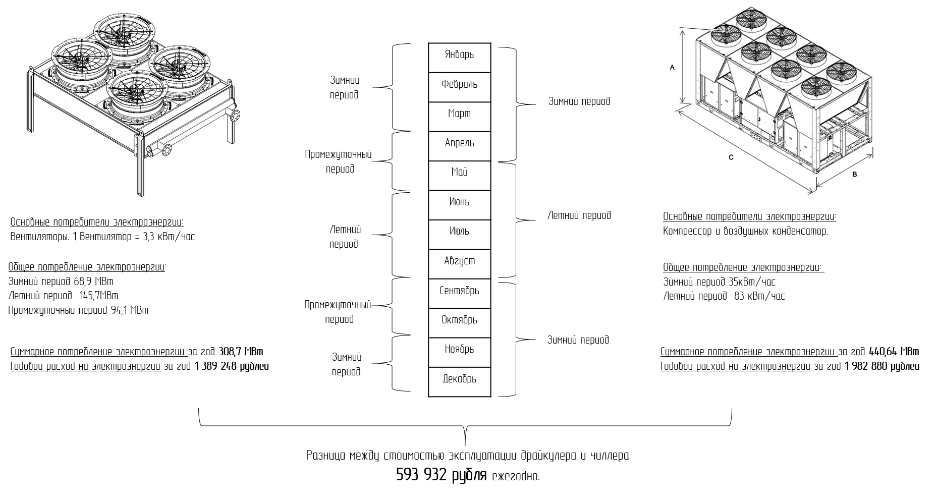 Böylece, kuru soğutucu ile soğutucunun işletme maliyeti arasındaki fark yılda 593.932 ruble olmaktadır. Mevcut soğutucunun değiştirilmesi veya kuru soğutucu satın alınması arasında seçim yaparken, kuru soğutucunun geri ödeme süresinin 3 yıl olacağını göz önünde bulundurmak gerekir.