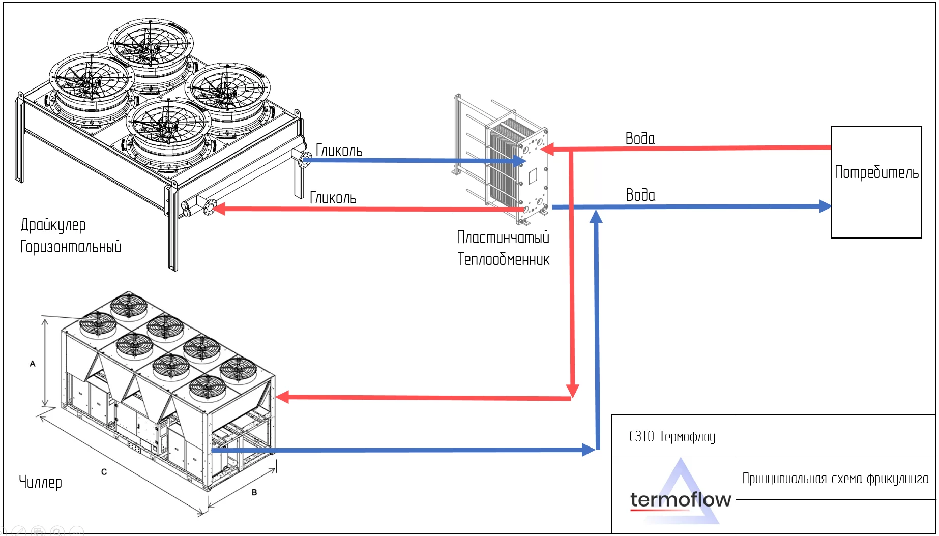 Maksimum tasarruf, hava soğutucuları ile soğutucuların birlikte kullanılmasıyla elde edilir. Bu sistem “serbest soğutma” olarak adlandırılır. Serbest soğutma prensibi, soğutucunun yazın, kuru soğutucunun ise kış ve ara dönemlerde çalışması esasına dayanır. Soğutucu yıl boyunca çalıştırıldığında, elektrik tüketimi yazın soğutucu, kışın ise kuru soğutucu çalıştığından birkaç kat daha fazla olur.